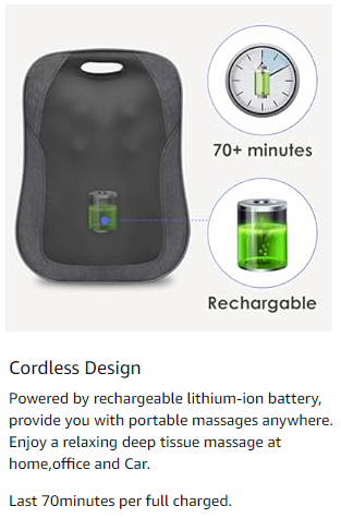 - Cordless & Portable-Comfier shiatsu back massager with heat is powered by rechargeable lithium-ion battery provide you with portable massages anywhere;Lightweight & compact, easy to carry,you can enjoy a relaxing deep tissue massage at home,office and Car (Last 70minutes per full charged.)